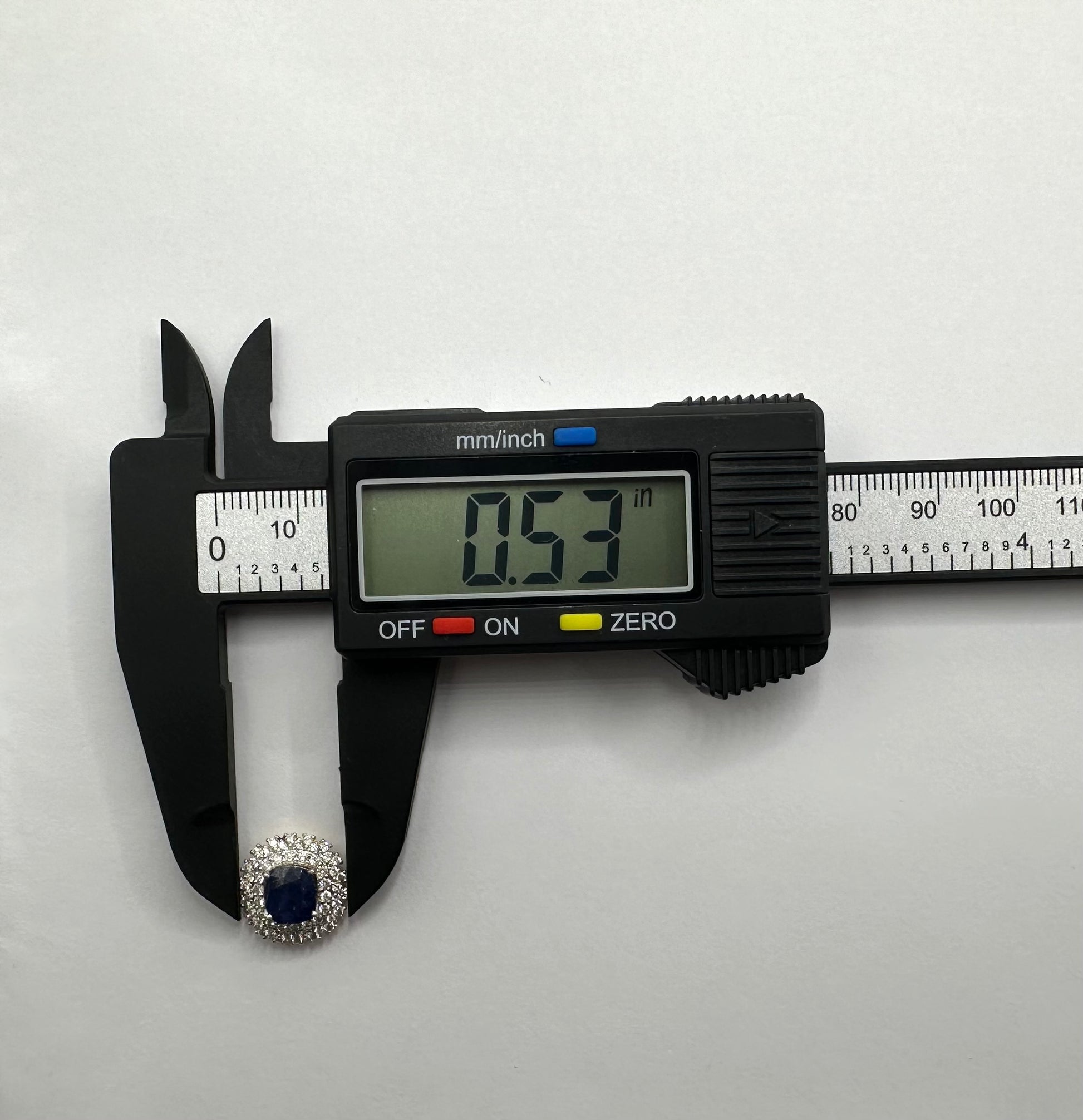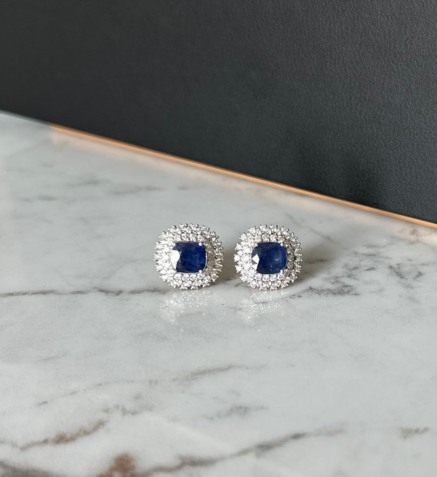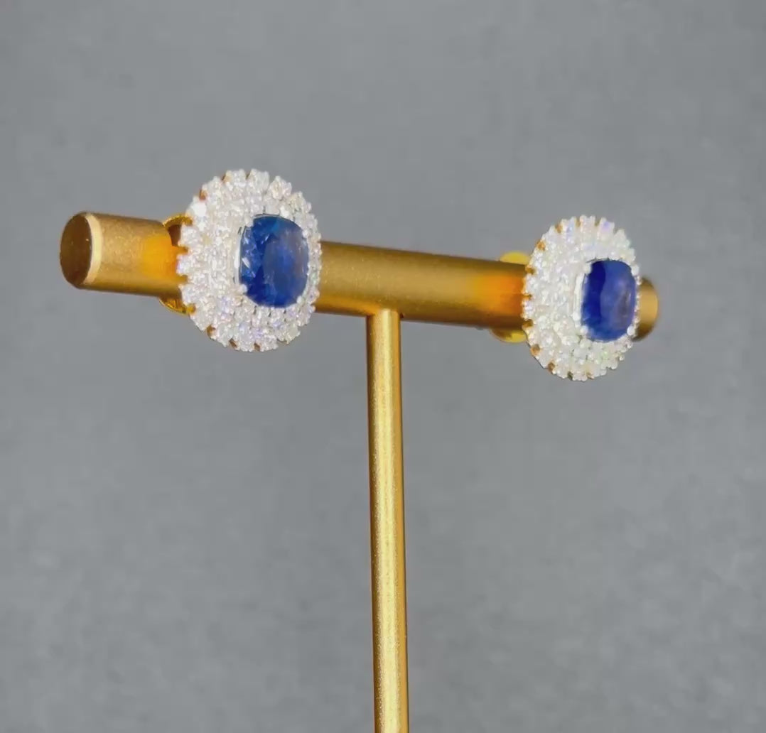 This stunning pair of sapphires totals 2.45 carats, framed with two full halos of diamonds for an eye-catching, elegant look. Set in 18k gold, it features a setting with a thicker gold base for durability and luxury. There is a small natural inclusion that does not affect the beauty or integrity of the earrings.
