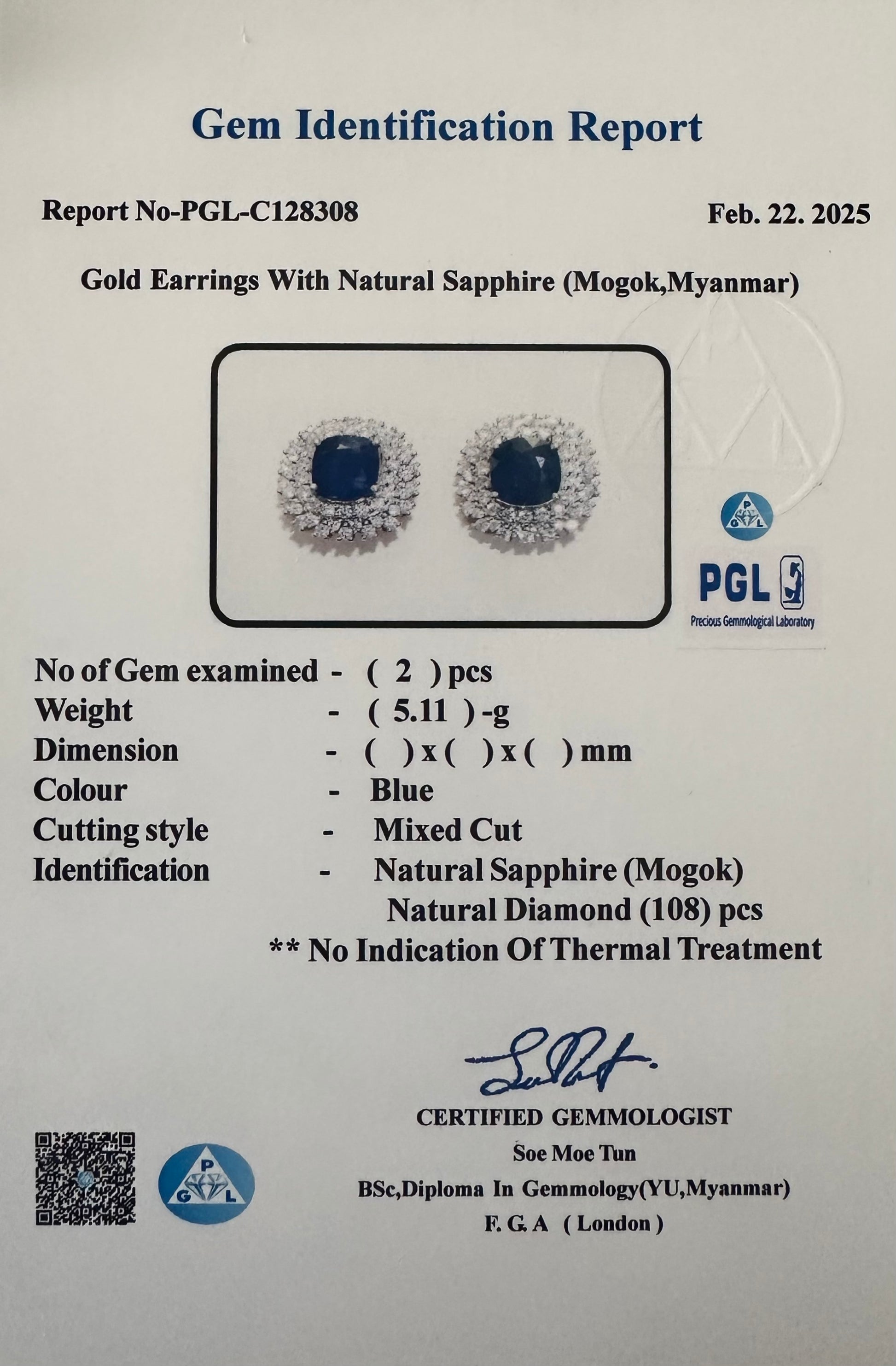 2.45ctw ရှိတဲ့ နီလာစုံကို စိန်၂ပတ် ဖြင့်ကြီးကြီးထည်ထည် လေးပတ်ထားပြီးရွှေချိန် အလျော့အတင် ပျမ်းမျှ ၆ပဲ ၃ရွေး ရွှေထူထူ လေးသုံးပြီး ခတ်ထားပါတယ်။ နားကပ်အလှကို မထိခိုက်တဲ့ အရှသေးသေးလေးတစ်ချက် ပါပါတယ်။